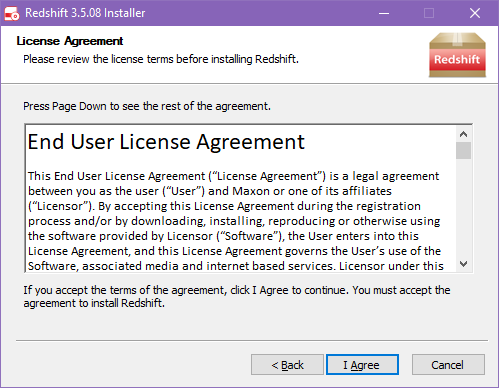 다음으로, 계속하기 전에 Redshift 소프트웨어 라이선스 계약을 주의 깊게 읽고 검토하세요.