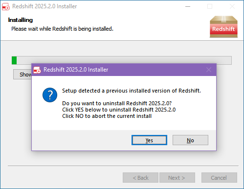 이전 버전의 Redshift에서 업데이트하는 경우, 현재 설치된 버전을 덮어쓰기 전에 확인 메시지가 표시됩니다. 설치를 계속하고 PC로 파일 복사를 시작하려면 “예”를 클릭하세요.