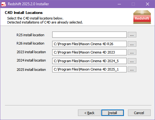 자동 구성에서 Cinema 4D를 선택한 후, 각 C4D 릴리스의 설치 위치를 선택할 수 있습니다. 각 버전에는 기본 Cinema 4D 설치 위치가 포함되며, 사용자 지정 설치 위치로 변경할 수 있습니다.