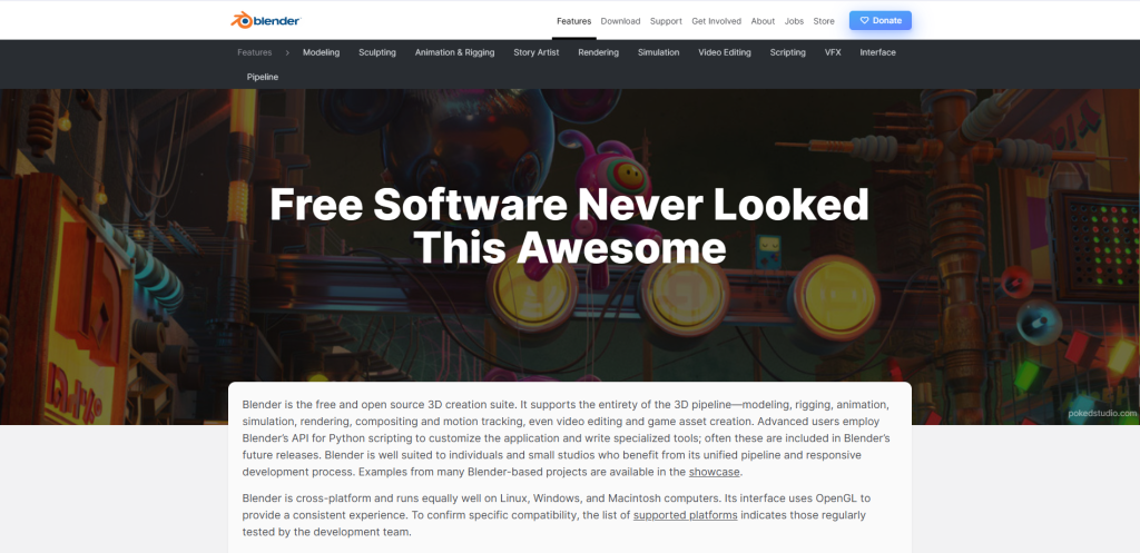 - 올인원 파이프라인: 단일 애플리케이션 내에서 모델링, 스컬핑, 애니메이션, 렌더링, 합성까지 처리 가능